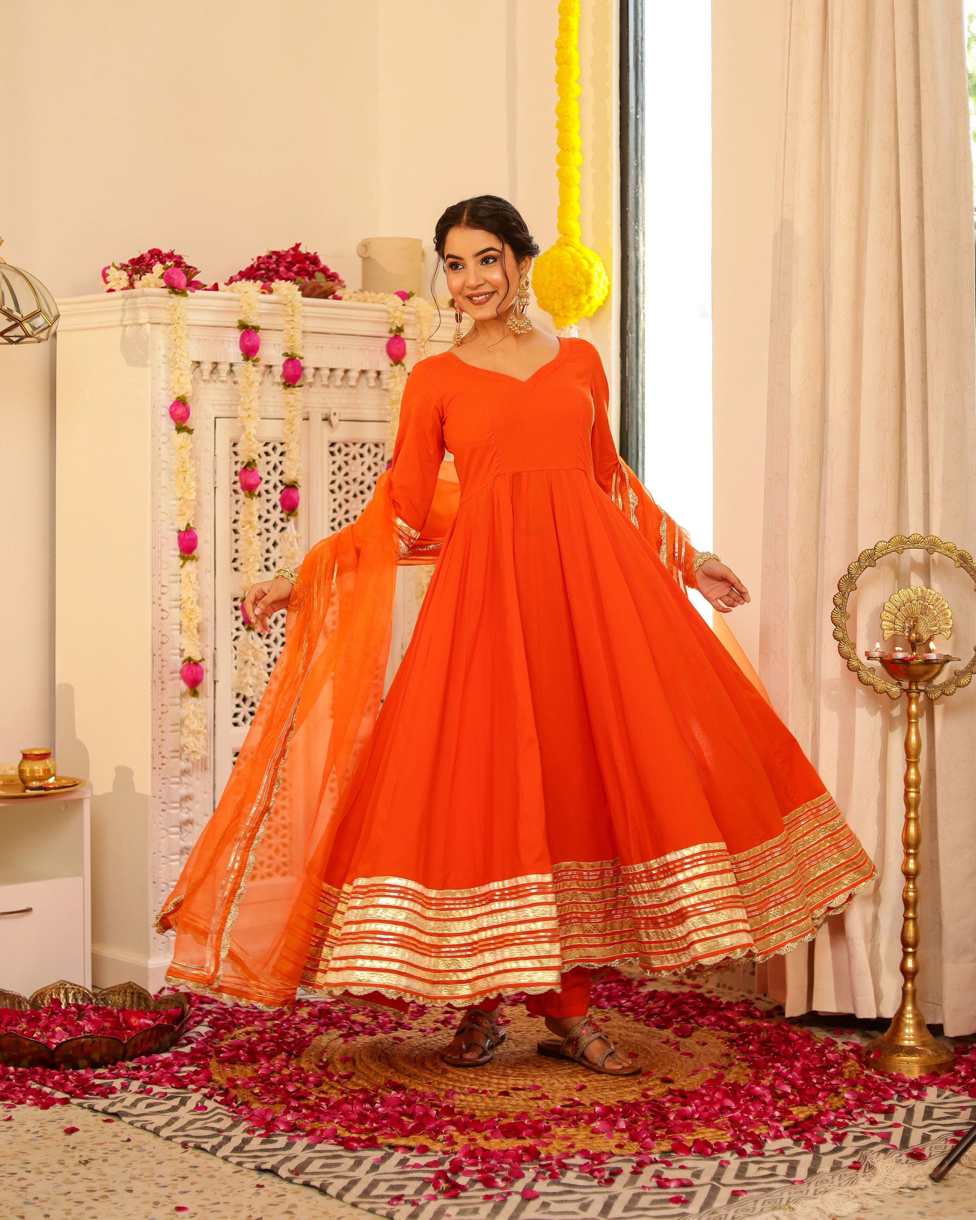 Cotton Anarkali Suit Set in vibrant Orange handcrafted with elegant gotta work detailing. Paired with a soft Organza Dupatta finished with delicate gotta borders for a festive luxe touch. Lightweight, breathable & royal — perfect for mehendi, haldi, festive pooja & day celebrations. Rajasthan rooted traditional charm in modern comfortable silhouette.